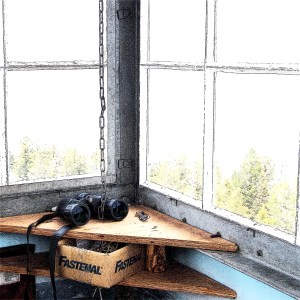 Once an hour he takes up his binoculars and scans the horizon for smoke, of which there’s plenty, but none worth radioing in. It’s drifting over from fires far off in Idaho.